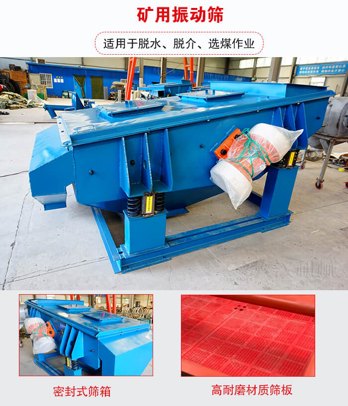 礦用振動篩采用振動電機(jī)做激振源、橡膠彈簧裝置支撐并隔振、高耐磨材質(zhì)篩板、密封式篩箱等