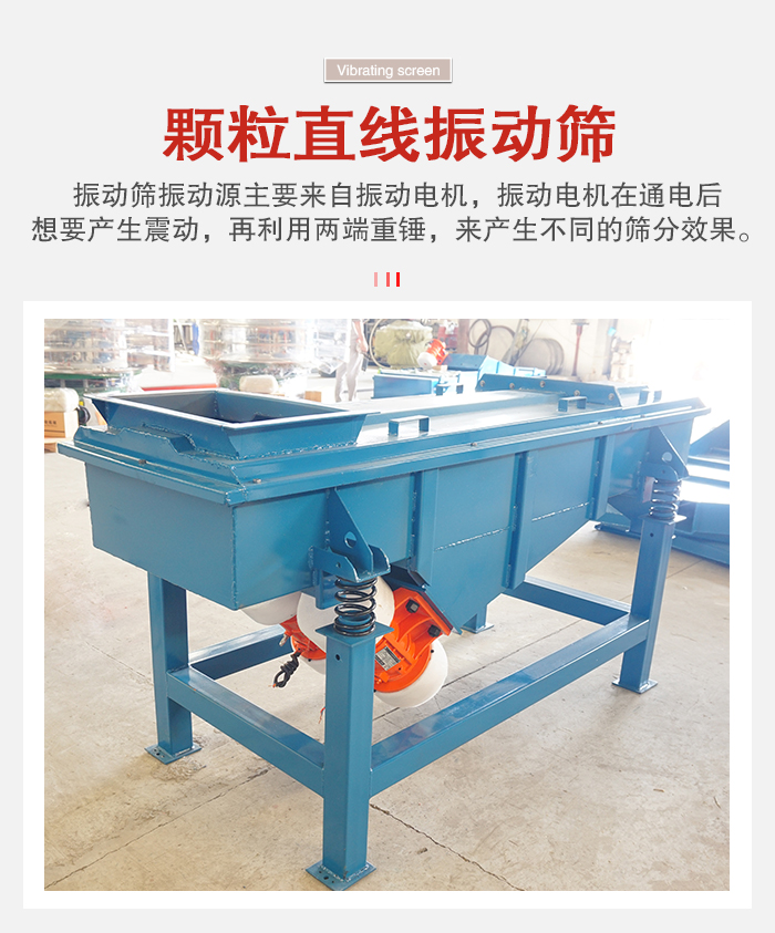 顆粒振動篩根據(jù)篩分原理主要分圓形和方形兩種結(jié)構(gòu),振動篩振動源主要來自振動電機(jī),振動電機(jī)在通電后想要產(chǎn)生震動,再利用兩端重錘,來產(chǎn)生不同的篩分效果。